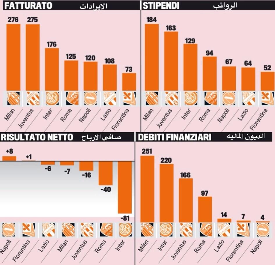 108 مليون عائدات ( 58 حقوق التلفزيون , 12 الاعلانات التجاريه , 11 الملعب , 27 اشياء اخرى ) - الديون الماليه للازيو 14 مليون - الرواتب 64 مليون - صافي الأرباح -6 مليون